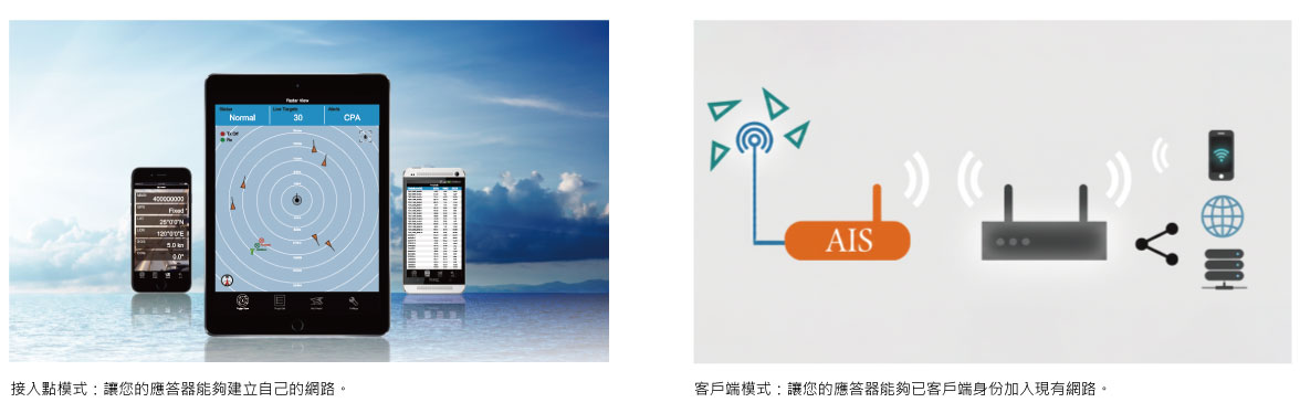 內建 Wi-Fi,支援客戶端模式與接入點模式,讓您的手機/平板變身移動式海圖裝置。