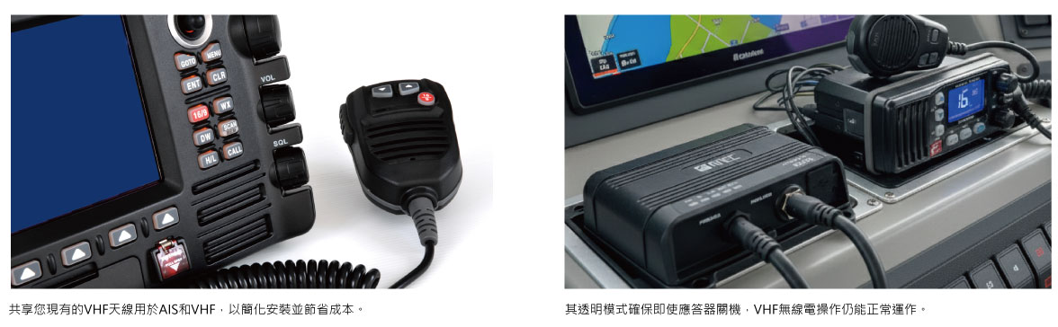 內建天線分配器讓AIS 和 VHF 無線電可以分享單一 VHF 天線。其高效能天線分配器在接收路徑上具有零插入損耗,在發射路徑上具有超低損耗。